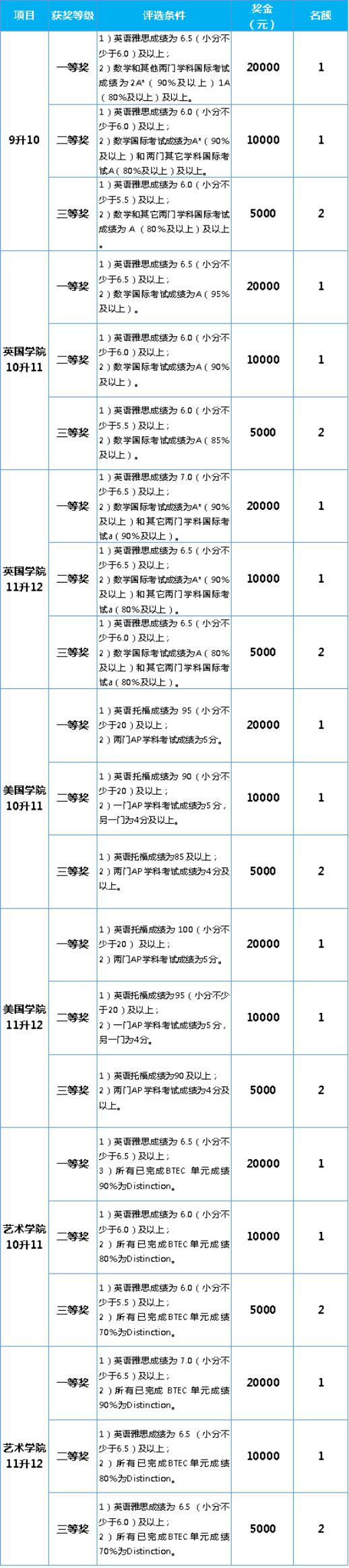 评选条件:一等奖需获得融通高中入学奖学金考试,英语和数学考试得分均为 90% 及以上;二等奖为考试前三名,英语和数学考试得分均为85%及以上;三等奖需考试排名前八,英语和数学考试得分均为80%及以上。