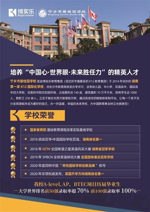 宁乡碧桂园学校是美国纽交所上市的中国的教育集团——博实乐教育集团(原碧桂园教育集团)于2014年创办,位于长沙宁乡高新区内(碧桂园山湖城旁)。学校占地面积近140亩,建筑面积10万平方米,配置齐全,校园环境良好;现有27个教学班级,近800生员工。学校是剑桥国际考试委员会(CIE)成员学校,是湖南十六年一贯制的国际学校,现设有国际幼儿园(含双语班)、国际中小学、国际高中、双语高中(中国普高)四个学部。